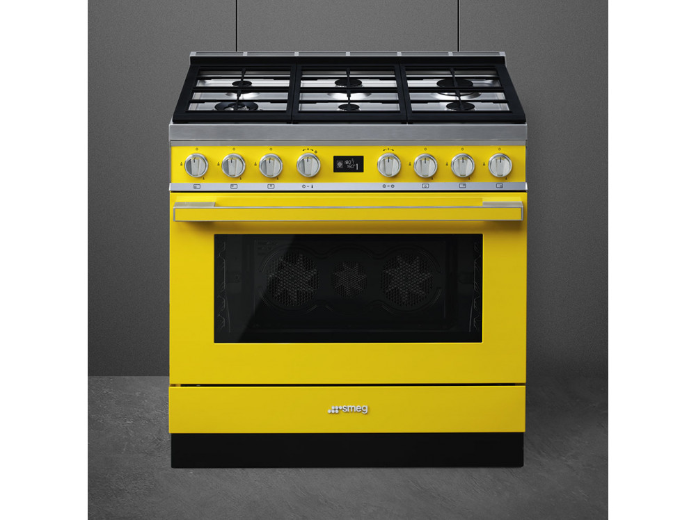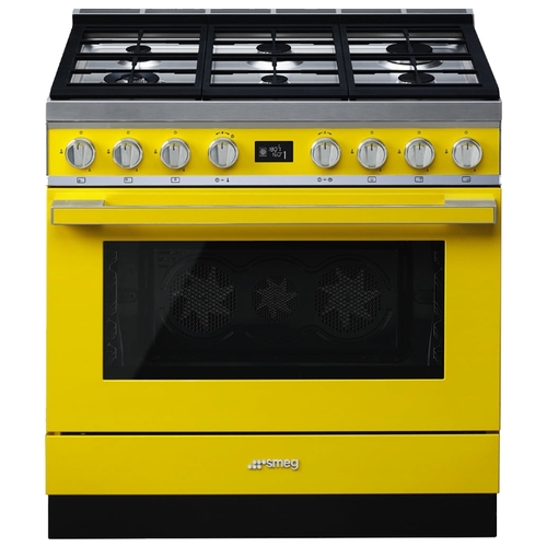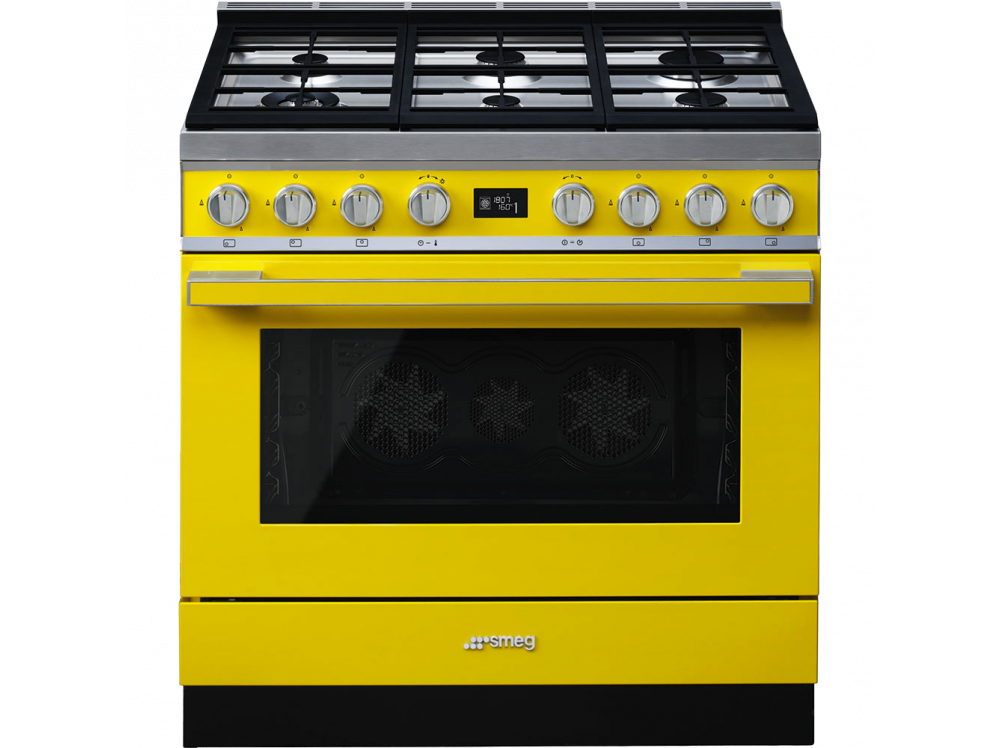Варочный центр Smeg коллекции Portofino представлен ярко-желтом цвете, что поможет создать контраст в любом современном кухонном интерьере. Конструкция предусматривает наличие газовой варочной поверхности и электрического духового шкафа для максимально комфортного процесса приготовления пищи. Защитный бортик исключает вероятность распространения жидкости за пределами варочной панели. Благодаря эргономичным поворотным переключателям устройством легко управлять.