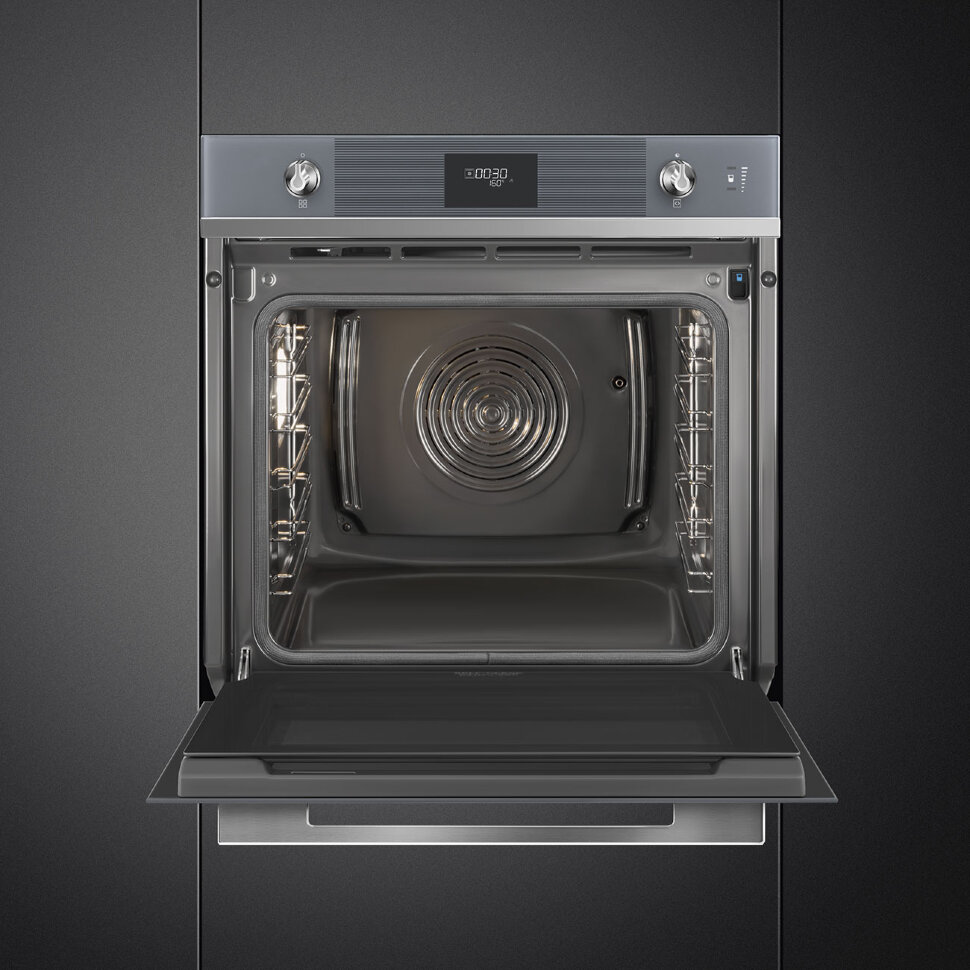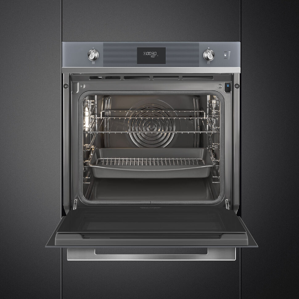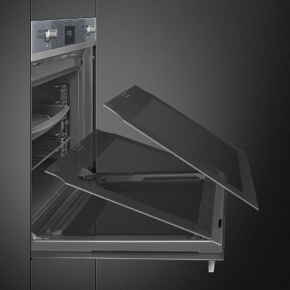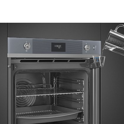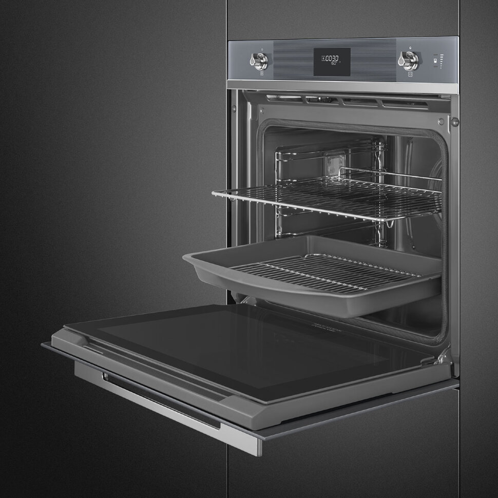 Духовой шкаф Smeg SOP6101S2S из коллекции Linea выполнен в цвете «Серебристое стекло Stopsol». Прибор предусматривает в себе пиролитическую систему очистки, которая при температуре около 500°C выжигает любые загрязнения — по завершении режима останется только протереть дно камеры мягкой тряпкой. Благодаря технологии подачи пара LITE-steam к некоторым функциям можно добавлять пароувлажнение (20 или 40% интенсивности пара), что обеспечивает наилучшие результаты приготовления.