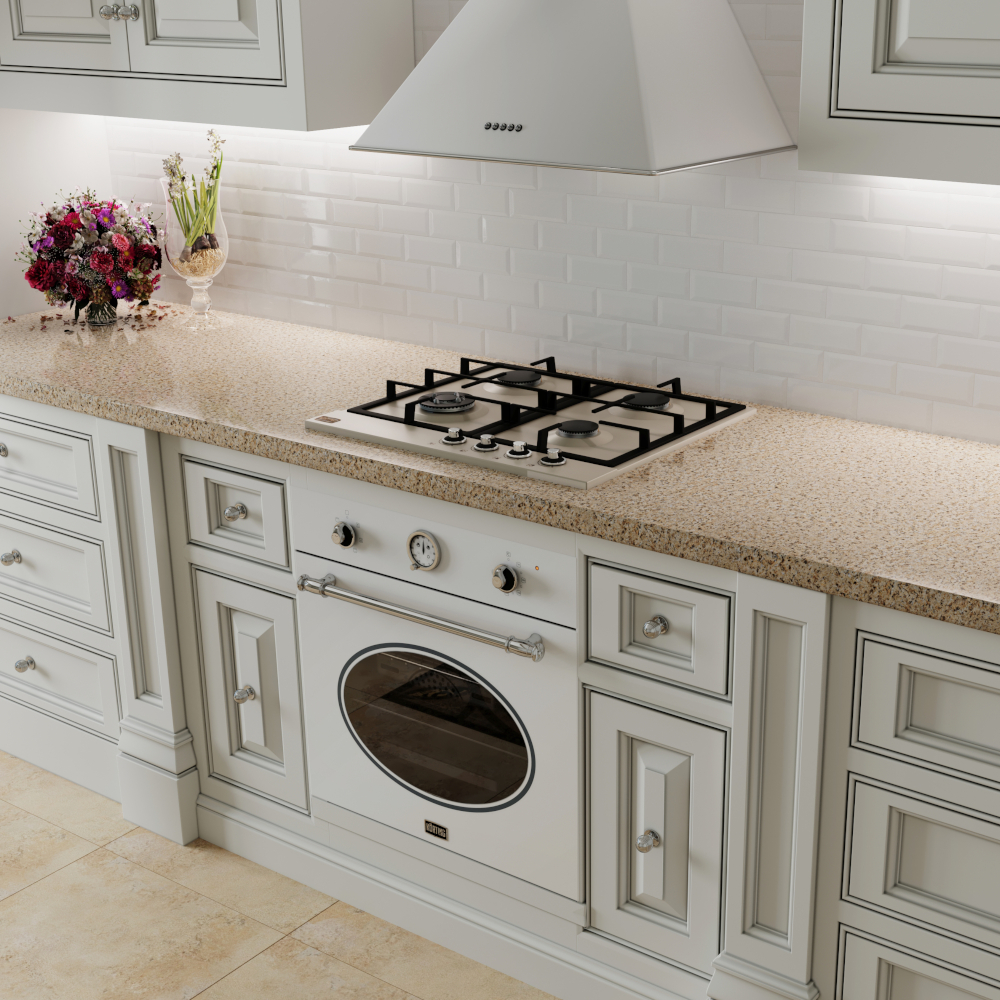 Это утонченные цвета, бронзовая или деревянная окантовка кухонной вытяжки, которые создают идеальное сочетание с натуральными материалами и фурнитурой кухонной мебели в классическом или ретро стиле.